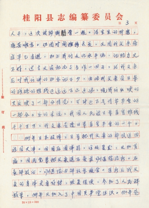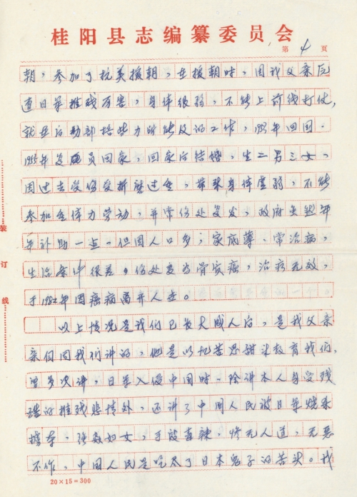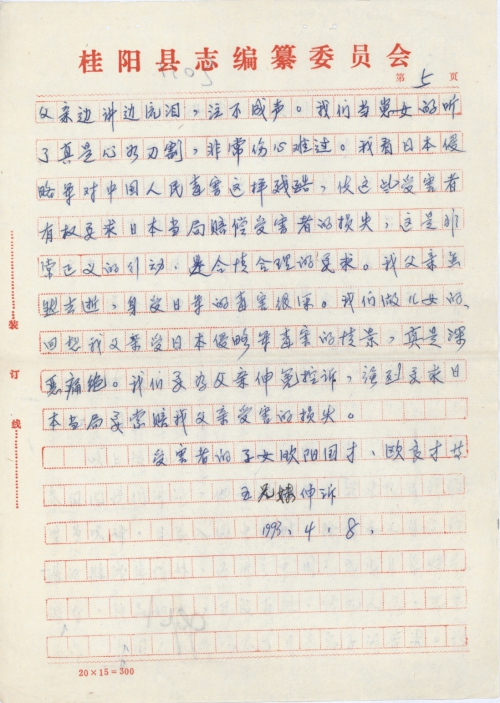 以上情况是我们已长大成人后,是我父亲亲自同我们讲的,他是以忆苦思甜来教育我们,曾多次讲,日军入侵中国时,除讲本人身受残酷的摧残悲情外,还讲了中国人民被日军烧杀掳夺,强奸妇女,手段毒辣,惨无人道,无恶不作,中国人民是吃尽了日本鬼子的苦头。我父亲边讲边流泪,泣不成声。我们当儿女的听了真是心如刀割,非常伤心难过。我看日本侵略军对中国人民毒害这样残酷,使这些受害者有权要求日本当局赔偿受害者的损失,这是非常正义的行动,是合情合理的要求。我父亲虽然去逝,身受日军的毒害很深。我们做儿女的,回想我父亲受日本侵略军毒害的情景,真是深恶痛绝。我们要为父亲伸冤控诉,强烈要求日本当局要索赔我父亲受害的损失。