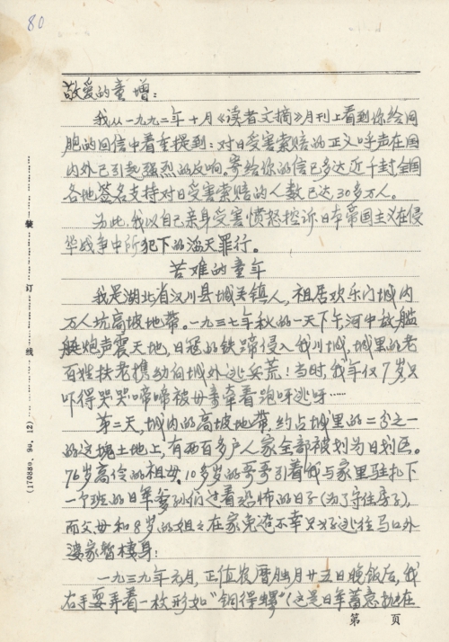 我从一九九二年十月《读者文摘》月刊上看到你给同胞的回信中着重提到:对日受害索赔的正义呼声在国内外已引起强烈的反响。寄给你的信已多达近千封,全国各地签名支持对日受害索赔的人数已达30多万人。