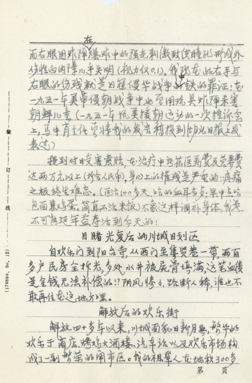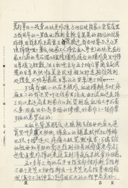 五十多年了,我的右手中指全部被炸断,食指断了两个关节,大拇指断去一个关节,无名指弯曲成钩状,(至今不能伸直)起作用不大的小指甲尚完好;而右眼因炸弹在爆炸中的强光刺激致使瞳孔形成外伤性白内障几乎失明(视力仅0.1)。我现在的右手与右眼的伤残就是日寇侵华战争中铁的罪证!在一九五一年美帝侵朝战争中也曾用玩具炸弹杀害朝鲜儿童(一九五一年抗美援朝运动的一次控诉会上,马牛肖主任曾将我的发言稿投到湖北日报上发表过)