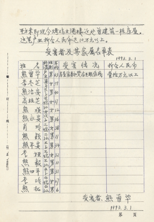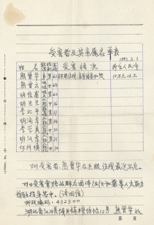 提到对日受害索赔,在治疗中所花医药费及营养费达两万元以上(折合人民币),身心上的摧残是严重的;疼痛之极终生难忘。(医治100多天,吃的血耳当餐;早、中点吃包面兼鸡蛋。简直不沾米饭)不[像]这样调补身体,我是不可能延年益寿活到今天的!