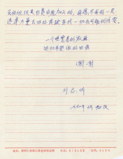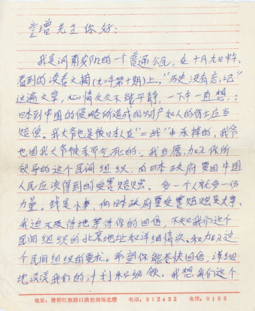 我是河南安阳的一个普通公民,在十月九日中午,看到的读者文摘(九二年第十期)上,“历史没有忘记”这篇文章,心情久久不能平静,一下午一直想,日本到中国的侵略所造成的财产和人的伤亡应当赔偿。我大爷也是被日本人在“二战”中杀掉的,我爷爷因我大爷被杀死而气死的。我自愿加入你所领导的这个民间组织,向日本政府要回中国人民应该得到的受害赔偿。多一个人就多一分力量。钱是小事,向日本政府要受害赔偿是大事。我迫不及待地等待你的回信,不知我们这个民间组织的北京地址和详细情况,和加入这个民间组织的要求。希望你能尽快回信,详细地谈谈我们的计划和纲领。我想我们这个民间组织是自费自愿加入的,我愿尽我的一点微薄力量去四处奔波查找一切可能的线索。