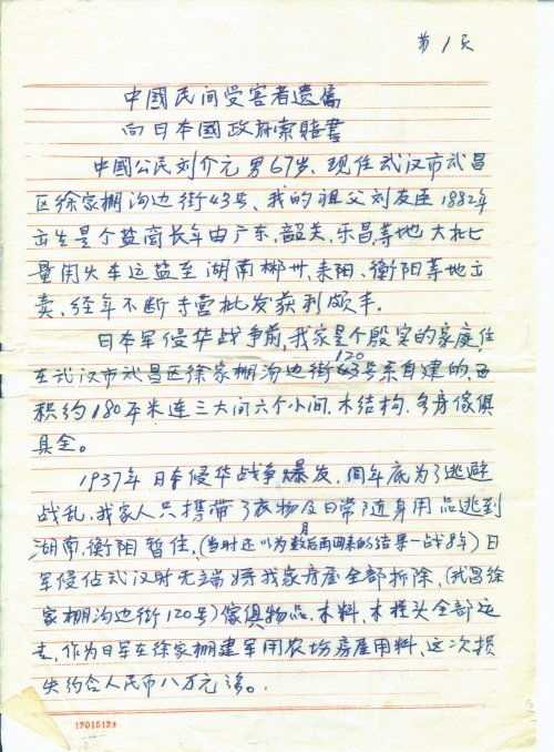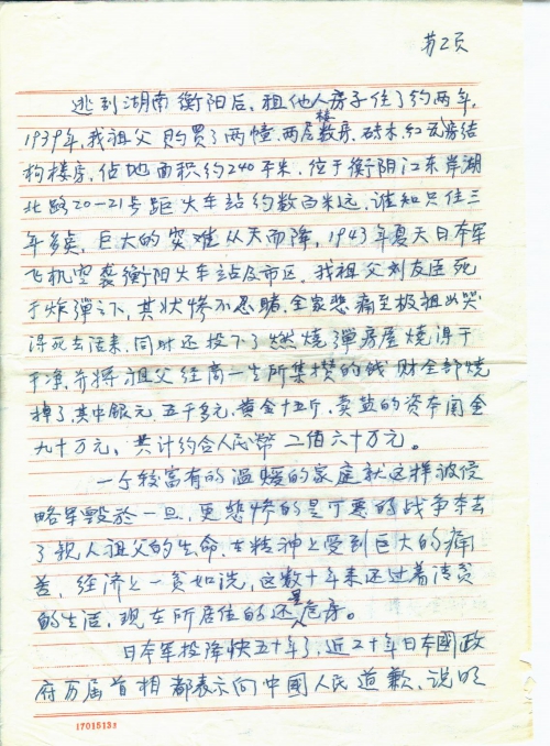 1937年日本侵华战争爆发,同年为了逃避战乱,我家人只携带了衣物及日常随身用品逃到了湖南衡阳暂住(当时还以为数月后再回来的,结果一战8年)日军侵占武汉时无端将我家房屋全部拆除(武昌徐家棚沟边街120号)家具物品,木料,木栓头全部运走,作为日军在徐家棚建军用农场房屋用料,这次损失约合人民币八万元之多。