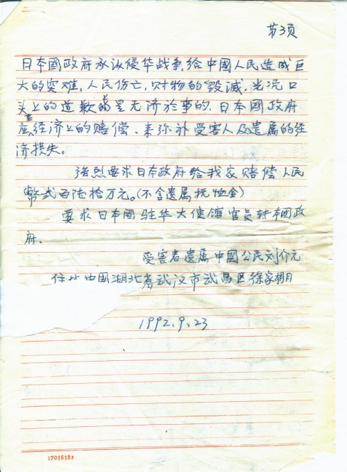 强烈要求日本政府给我家赔偿人民币贰佰陆拾万元。(不含遗属抚恤金)