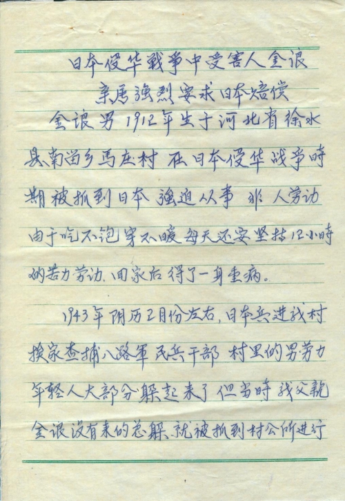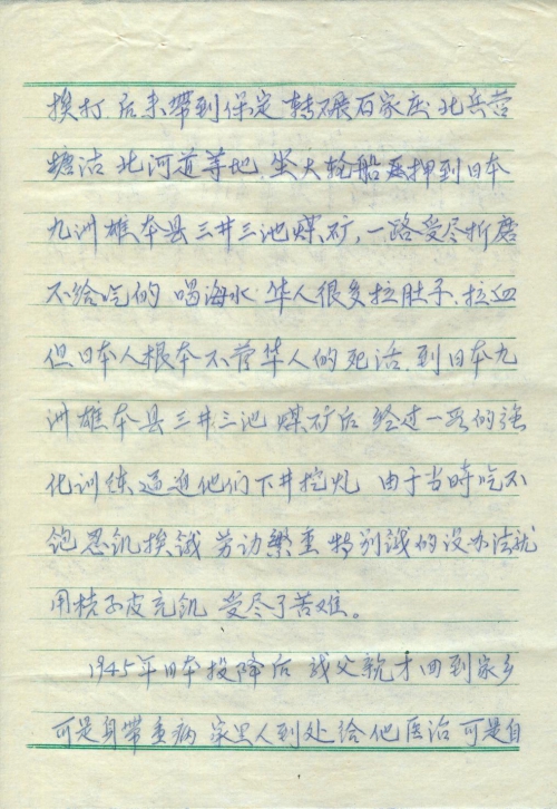 1943年阴历2月份左右,日本兵进我村挨家查捕八路军民兵干部,村里的男劳力年轻人大部分躲起来了,但当时我父亲金浪没有来的急躲,就被抓到村公所进行挨打,后来带到保定转碾石家庄北兵营塘沽北河道等地,坐火轮船押到日本九州[熊]本县三井三池煤矿,一路受尽折磨,不给吃的,喝海水,华人很多拉肚子、拉血,但日本人根本不管华人的死活,到日本九州[熊]本县三井三池煤矿后,经过一段的强化训练逼迫他们下井挖煤,由于当时吃不饱,忍饥挨饿,劳动繁重,特别饿的没办法就用橘子皮充饥,受尽了苦难。