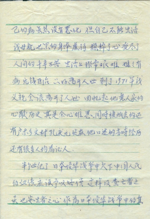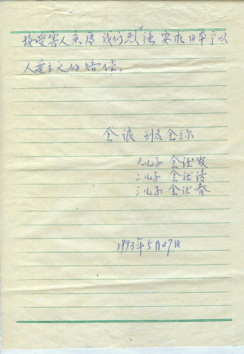 半个世纪了,日本侵华战争中欠下中国人民的血债应该予以赔偿,这样得查亡者之灵,也安生者之心,作为日本侵华战争中的直接受害人亲属,我们强烈要求日本予以人道主义的赔偿。