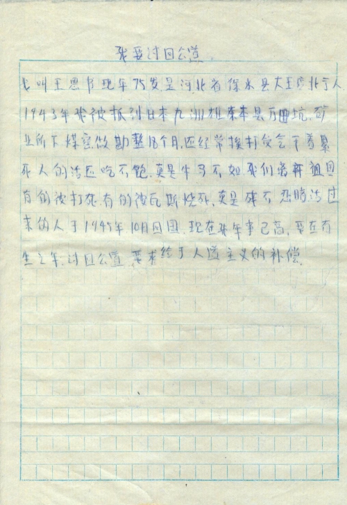 21 10 月, 2018 s3642 Share EmailTwitterFacebookGoogle +PinterestTumblrLinkedinVkontakte 信扫描序列号:s3642 写信日期:信中没写 写信地址:河北省保定市徐水县 受害日期:1943-1945 受害地址:河北省保定市徐水县 写信人:王思书 受害人:王思书 类别:劳工(SL) 细节:1943年我被日军抓去日本雄本县做劳工下煤窑18个月,吃不饱穿不暖,常挨打过着牛马不如的生活,1945年回国。备注:信封丢失 我要讨回公道 我叫王恩书,现年75岁,是河北省徐水县大王店北街人 1943年我被抓到日本九州[熊]本县万田坑矿业所下煤窑,做苦力,整18个月,还经常挨打受气,干着累死人的活还吃不饱,真是牛马不如,我们离开祖国,有的被打死,有的被瓦斯烧死,真是惨不忍睹,活过来的人于1945年10月回国,现在我年事已高,要在有生之年,讨回公道,要求给予人道主义的补偿。 21 10 月, 2018 10000cfj_3o5som 劳工(SL)