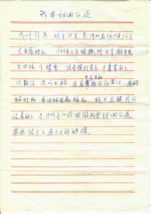 21 10 月, 2018 s3643 Share EmailTwitterFacebookGoogle +PinterestTumblrLinkedinVkontakte 信扫描序列号:s3643 写信日期:信中没写 写信地址:河北省保定市徐水县 受害日期:1943-1945 受害地址:河北省保定市徐水县 写信人:韩其 受害人:韩其 类别:劳工(SL) 细节:1943年我被日军抓去日本雄本县做劳工,吃不饱穿不暖,常挨打过着牛马不如的生活,期间有被打死有被瓦斯炸死的,我1945年回国。备注:信封丢失 我要讨公道 我叫韩其,现年73岁,是河北省徐水县河乡大赤鲁村人 1943年3月被抓到日本[熊]本县万田坑下煤窑,经常挨打受气,干着累死人的活,还吃不饱,过着牛马不如的生活,有的被打死,有的被瓦斯烧死,[惨]不忍睹,我们活着的人于1945年10月份回国,我要讨回公道,要求给予人道主义的补偿。 21 10 月, 2018 10000cfj_3o5som 劳工(SL)