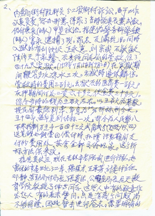 回忆1938年,我的社会职业,伪辽阳县政府内务局街村股科员,分工管街村诉讼。由于工作认真负责,惩办邪恶,得罪了当时伪县长黄贰叙,伪[副]县长(日本人)甲斐政治。指使伪警务科警务股(日本人)富永逮捕了我,罪名反满抗日,同时入狱的有刘汝沢、王永惠、刘宗武、石敬敏、陈沛天、于泉馨,后来经同志们的营救,住了四十九天冤狱。(1938年7月15日到9月2日)在冤狱期间鞭笞多次,凉水三次。出狱时遍体鳞伤。营救时的费用三百多元。出狱后的医药费一百多元。在押期间停发工资六十多元,伙食费三十多元。综合当时的钱为五百元左右,以五百元为基数。按民间最低利率、年息为20%,折算到今天,五十四年,每年复利结算一次,折合为人民币八百三十八万五千一百四十三元二角二分(838,5143.22)这笔钱如能索回,偿付时扣除活动期间支付的费用外,其余全部交给国家。这个折算方法供参考。