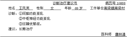 患者王凤英,于1988年6月12日来我院诊治,观察一周,其症:精神抑郁,表情淡漠,有时喃喃独语,时悲时喜,哭笑无时,不思饮食;有时坐卧不安,打人骂人;有时昼夜不睡;有时胡思乱想,不认亲人。舌苔微黄,脉象滑数。诊断为狂躁忧郁证(“证”编辑为“症”)。根据患者家属述,患者于1943年9月25日早上,日本鬼子到她家找她丈夫,把枪口对准王的胸口,将刀放在王的脖子上,又让狼狗咬她,并把王的衣服撕破放在炉火上烧,并熏死她的亲生女儿,日本鬼子走后,王便自言自语,时哭时笑,有时打人骂人。解放后,到太原,北京等地治疗,诊断为精神分裂症,后来到我院治疗,根据此病,原因主要是因恐吓,又死掉女儿而悲痛交加,精神受到强烈刺激,忧思恼怒引起阴阳平衡失调,心神失主所致。经我院治疗几年后,现在虽然比以前好转,但仍不能自理。
