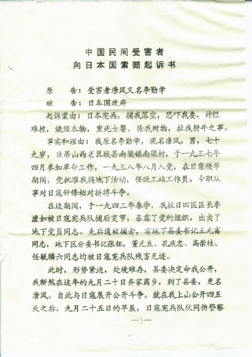 看了常的亲信和中国民间受害者向日本国索赔起诉书的内容和格式,燃起了我对日本帝国主义者法西斯侵略者的深仇大恨,忆起四十年代初战斗的里程,誓要为同我战斗中而牺牲的六位同志,讨还血债并赔偿损失。(我都已写了证明)