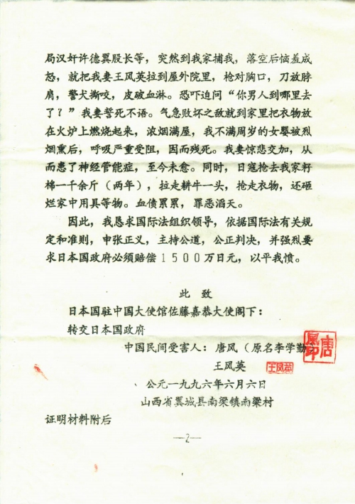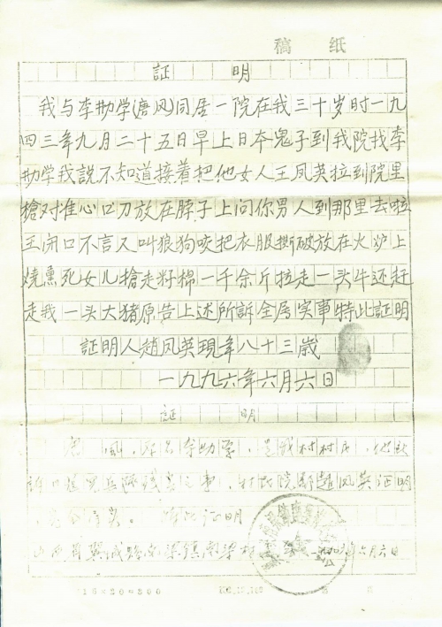 我与李勤学(唐风)同居一院,在我三十岁时,一九四三年九月二十五日早上,日本鬼子到我院找李勤学,我说不知道,接着把他女人王凤英拉到院里,抢对准心口,刀放在脖子上问你男人到那(“那”编辑为“哪”)里去啦,王闭口不言人叫狼狗咬,把衣服撕破放在火炉上烧,熏死女儿,抢走籽棉一千余斤,拉走一头牛,还赶走我一头大猪,原告上述所述全属实事,特此证明