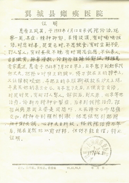 去年8月,山西省孟县一民办教师把当地几个当年被迫给日本军做慰安妇的受害妇女的材料,送给了童增。