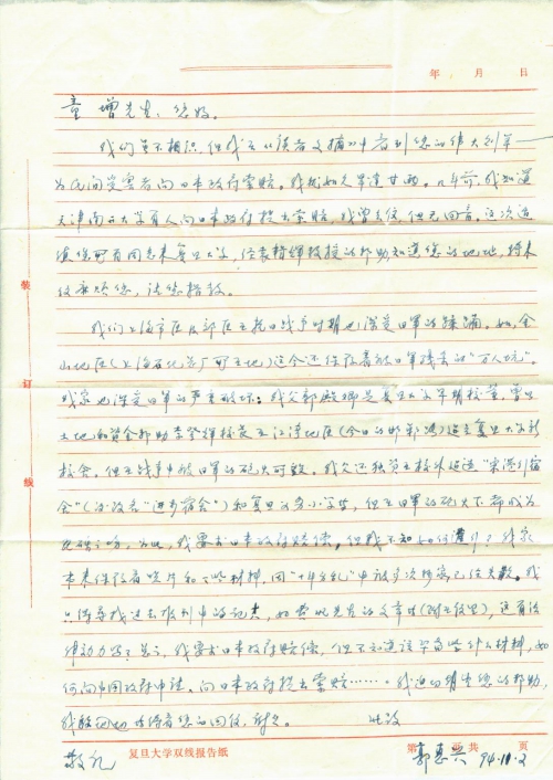 我们上海市区及郊区在抗日战争时期也深受日军的蹂躏。如,金山地区(伤害石化总厂所在地)迄今还保存着被日本残杀的“万人坑”。我家也深受日军的严重破坏:我父郭殿卿是复旦大学早期校董,曾以土地和资金帮助李登辉校长在江湾地区(今日的邯郸路)建立复旦大学新校舍。但在战争中被日军的[炮]火所毁。我父还独资在校外建造。“宋港分宿舍”(后改名“进步宿舍”)和复旦义务小学等,当在日军的[炮]火下都成为瓦砾之场。为此,我要求日本政府赔偿,当我不知如何进行?我家本来保存着照片和一些材料,因“十年方乱”中被多次抄家,已经失散。我只得寻找过去报刊中的纪实,如费巩先生的文章等(附在信里),这有法律效力吗?总之,我要求日本政府赔偿,但不知道该准备些什么材料,如何向中国政府申诉,向日本政府提出索赔……。我迫切期望您的帮助,我殷切地等待看您的回信,回信。