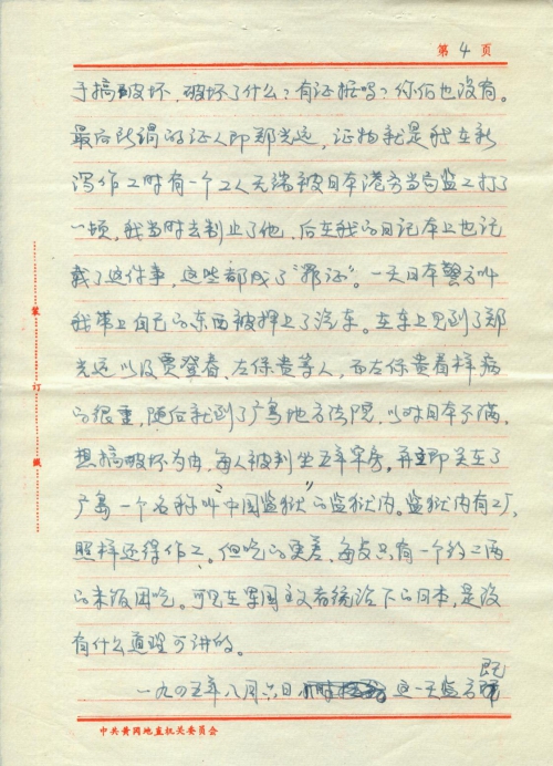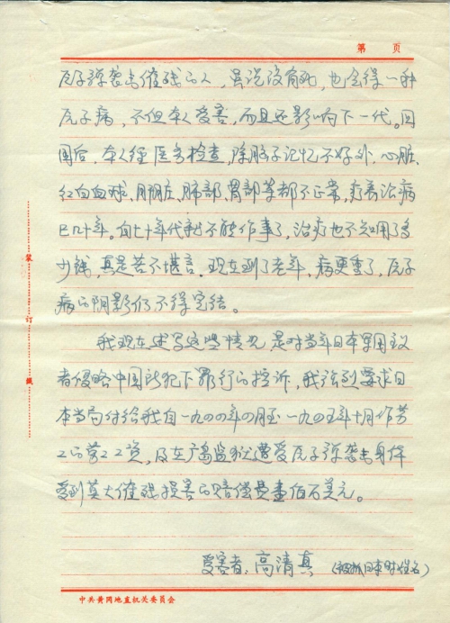 我们三个中国人,一路上几经周折,经日本下关过海峡到朝鲜釜山、汉城、信义州,跨鸭绿江到了中国的安东(现易名丹东)。回到祖国立即倍感亲切。从强迫到日本作劳工。坐牢房,又遭原子弹袭击,这一系列对人的摧残,至今已四十多年了。回国之初人们说我像个傻子,反映(“映”编辑为“应”)迟钝,自己的感觉是记忆力大不如以前,脑子不好使用,体质也相当差。据知遭受过原子弹袭击摧残的人,虽说没有死,也会得一种原子病,不但本人受害,而且还影响下一代。回国后,本人经医务检查,除脑子记忆不好外,心脏、红白血球、肝脏、肺部、胃部等都不正常,疗养治病已几十年。自七十年代就不能做事了,治疗也不知用了多少钱,真是苦不堪言,现在到了老年,病更重了,原子病的阴影仍不得完结。