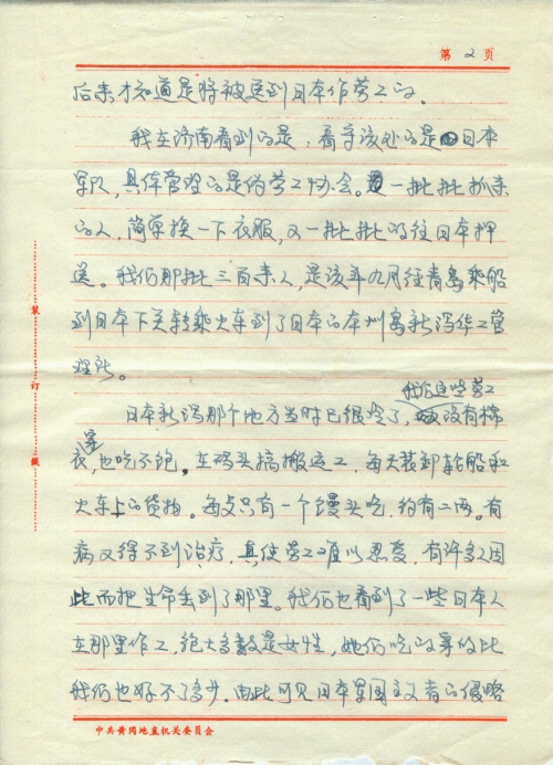 At that time, Niigata was already quite cold. But we weren’t provided with quilted cotton clothes and enough food. We had to load and unload goods from ships and trains at the port every day. We were given only a bun, about 100g, to eat for each meal and we couldn’t get treatment when we got sick. Life was so unbearable. Many laborers died there. We also saw some Japanese people, mostly women, working there and their clothes and food were not much better than ours. It is palpable that Japanese militarists have caused a great hardship not only to Chinese people, but to the people of some other Asian countries, also, as well as the Japanese people.