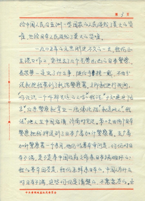 One day shortly after January 1, 1945, while we were working at the port, several Japanese policemen came. We knew something went wrong. Suddenly, they handcuffed me and took me to the Niigata Police Station without giving any reason. I was immediately interrogated. “Do you know a person named Zheng Guangyuan?” I said, “I don’t know anyone by that name.” Later, a policeman took out a photo and said, “It is him.” I said, “He is from Linqing, China. I saw him in Ji’nan.” The next day, two Japanese policemen escorted me to the Police Station of Kake, Hiroshima, Japan. For over a month during my stay there, their question was basically, “You are resentful of Japan. Are you here to sabotage Japan at the behest of the Chinese government?” My answer was basically, “How did we come to Japan and why are the Chinese people resentful of Japan? You know the answers better than me. I don’t need to answer. As for sabotaging Japan, what did I sabotage? Do you have any evidence? No, you don’t.” The so-called witness was Zheng Guangyuan and the material evidence was a recording in my diary. One day, when I was working in Niigata, a worker, for no reason, was beaten by the supervisor of the Japan Port Authority. I stopped the supervisor and recorded this incident in my diary. And this became their material evidence. Then one day, a Japanese policeman asked me to take my belongings with me and transported me in an automobile, where I saw Zheng Guangyuan, Jia Dengchun and Zuo Baogui. Zuo Baogui looked to be very sick. Afterwards, we were taken to the Hiroshima District Court and each of us was sentenced to 5 years in prison for resenting Japan and planning sabotage. I was immediately put in a prison called China Prison in Hiroshima. There was a factory in the prison, so I still had to work. But the food was worse. We were only given a rice ball of about 100 kg for each meal. Under the rule of Japanese militarists, there is no room for justice.