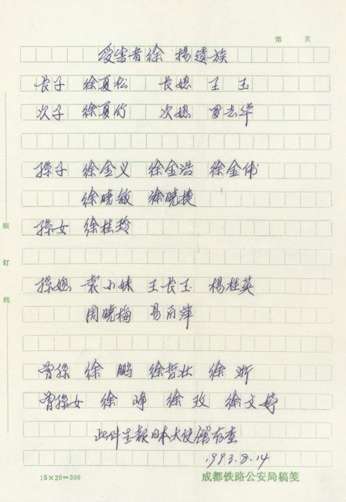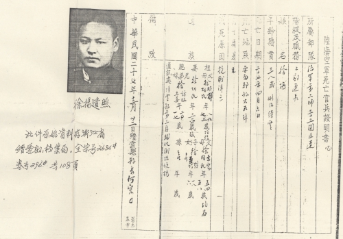 我父亲徐扬在1938年4月6日在抵御日[寇]侵华战争中于鲁南邳县火石埠被日军炮击弹击中阵亡。时年38岁。现将死亡证明书和遗照一并寄上,请予受理。