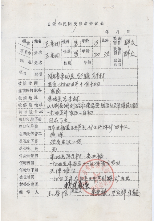 我兄王老肉系河北省栾城县豆于村人,在日本侵华期间,我兄王老肉于农历一九四四年十一月十三日,公里十二月二十七日在本村被抓,当年十九岁,抓后解送元氏县城,于农历一九四四年十二十二日,公历一九四五年六月二十五日由元氏解送石家庄南兵营,而后由南兵营的送天津塘沽港,在塘沽过春节,农历一九四五年正月初,从塘沽乘轮船到日本下关,再乘轮船和火车到北海道三井芦别煤矿,住在兴亚辽,在煤矿挖烟煤。
