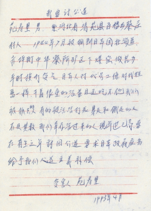 细节:1944年7月我们被抓到日本北海道的矿区下煤窑当苦力将近2年,分文不给每天吃不饱穿不暖还经常挨打受气有的人甚至活活被打死。我要在有生之年向日本国讨回公道。备注:信封丢失