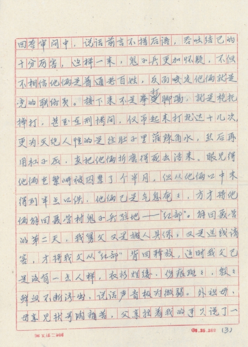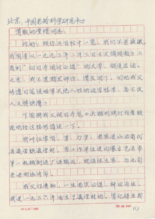 细节:我8岁那一年父亲和同乡去伯父家取粮食的途中遇上日军扫荡被抓了起来,日军说他们是八路便实施了残酷的残害折磨的死去活来。半个月后日军放了他们但已不成人样没多久父亲就过世了。我父亲的死时日军造成的,所以日本方面必须承担这个责任。备注:信封丢失