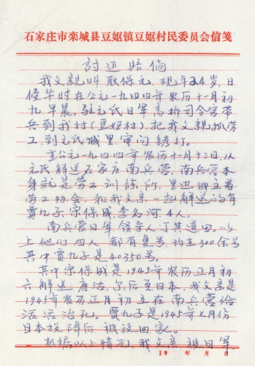 细节:我的父亲在1944年农历11月9日被日军抓到城里审问拷打,1945年农历正月初5死在了兵营里。父亲惨死兵营我们必须向日本索要赔偿。备注:信封丢失