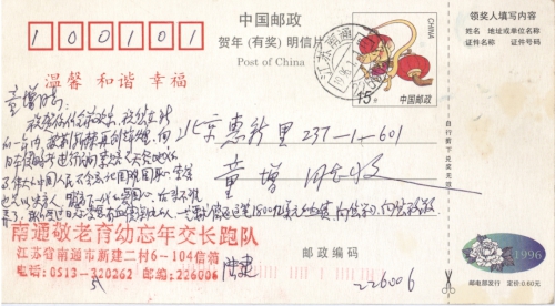 21 10 月, 2018 s3673 Share EmailTwitterFacebookGoogle +PinterestTumblrLinkedinVkontakte 信扫描序列号:s3673 写信日期:1996-01-01 写信地址:江苏省南通市 受害日期:无 受害地址:无 写信人:陆建 受害人:无 类别:其它(OT) 细节:坚决支持索赔。备注:信封丢失 童增同志: 祝贺你们全家欢乐,祝您在新的一年内,披荆斩棘再创辉煌,向日本侵略者进行民间索赔是天经地义的事,伟大的中国人民不会忘记国难国耻,索赔也是以史育人,哺育下一代的爱国心,后来不难弄了,我们受过日本凌辱有血债深仇的人,一定要求偿还这笔1800亿美元的血债,向您学习,向您致敬。 南通敬老育幼忘年交长跑队 江苏省南通市新建二村6-104信箱 电话:0513-3520262 邮编:226006 陆建 226006 21 10 月, 2018 10000cfj_3o5som 其它(OT)