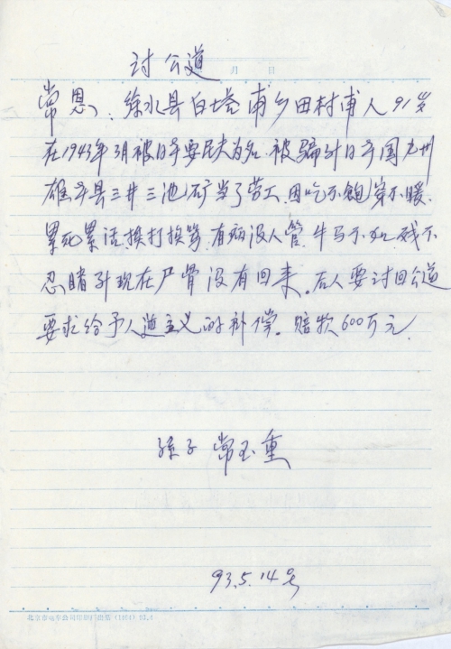 21 10 月, 2018 s3682 Share EmailTwitterFacebookGoogle +PinterestTumblrLinkedinVkontakte 信扫描序列号:s3682 写信日期:1993-05-14 写信地址:河北省保定市徐水县 受害日期:1943-03 受害地址:河北省保定市徐水县 写信人:常恩 受害人:常玉重 类别:劳工(SL) 细节:常玉重在1943年3月被日本军骗到日本做劳工,在这期间吃不饱穿不暖干重活还经常挨打病了也不给医治最终死在日本尸骨也没有回来。作为他的后人我要向日本政府讨回公道。备注:信封丢失 讨公道 常恩:徐水县白塔甫乡田村甫人,91岁,在1943年3月被日本要民夫为名,被骗到日本国九州雄本县三井三池矿当了劳工,因吃不饱穿不暖,累死累活,挨打挨骂,有病没人管,牛马不如惨不忍睹到现在尸骨没有回来,后人要讨回公道要求给予人道主义的补偿。赔款600万元。 孙子 常玉重 93.5.14号 21 10 月, 2018 10000cfj_3o5som 劳工(SL)