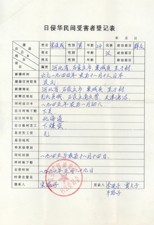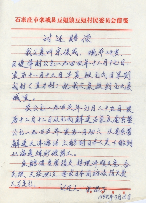 细节:1944年农历11月13日早晨日军到我村把我父亲抓到县城里关押后又送往日本做劳工,日本政府必须赔偿我父亲的损失。备注:信封丢失