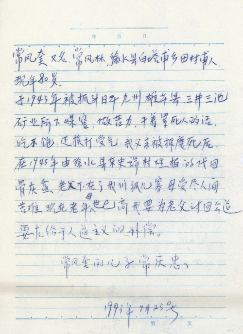 细节:我的父亲在1943年被抓到日本三井三池下煤窑做苦力干着累死人的活也吃不饱饭还经常挨打受气最后死在了日本,我们孤儿寡母的受尽人间苦难,我要为我父亲讨回公道要求日本政府赔偿。备注:信封丢失