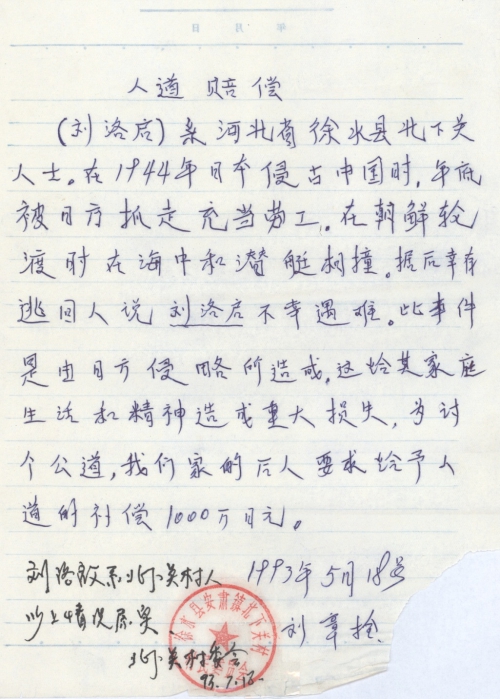 21 10 月, 2018 s3694 Share EmailTwitterFacebookGoogle +PinterestTumblrLinkedinVkontakte 信扫描序列号:s3694 写信日期:1993-05-18 写信地址:河北省保定市徐水县 受害日期:1944 受害地址:河北省保定市徐水县 写信人:刘章栓 受害人:刘洛启 类别:劳工(SL) 细节:刘洛启在1944年被日军抓走当劳工在朝鲜遇难,此事件是由日方造成必须给予赔偿。备注:信封丢失 人道赔偿 (刘洛启)系河北省徐水县北下关人士。在1944年日本侵占中国时,年底被日方抓走充当劳工。在朝鲜轮渡时在海中和潜艇相撞。据后幸存逃回人说刘洛启不幸遇难。此事件是由日方侵略所造成。这给其家庭生活和精神造成或重大损失,为讨个公道,我们家的后人要求给予人道的补偿1000万日元。 刘洛啟系北下关村人 1993年5月18号 刘章拴 以上情况属实 北下关村委会(村委章) 93.7.18 21 10 月, 2018 10000cfj_3o5som 劳工(SL)