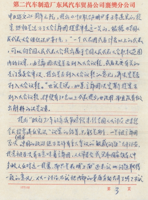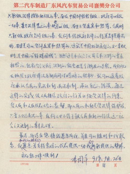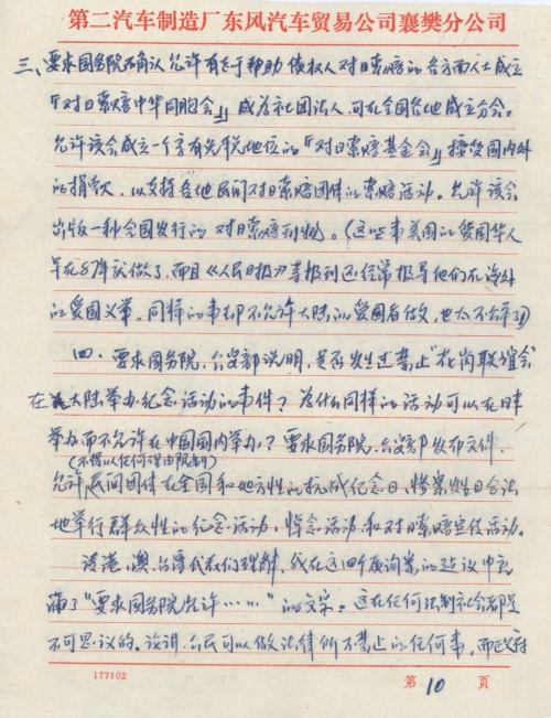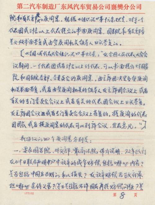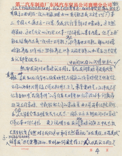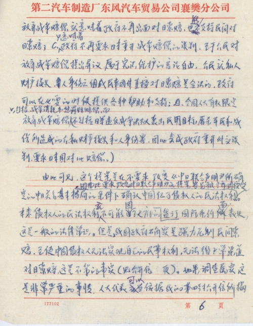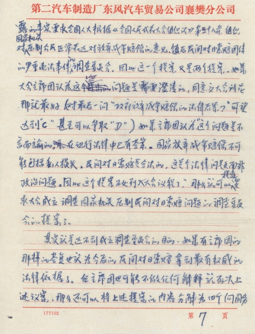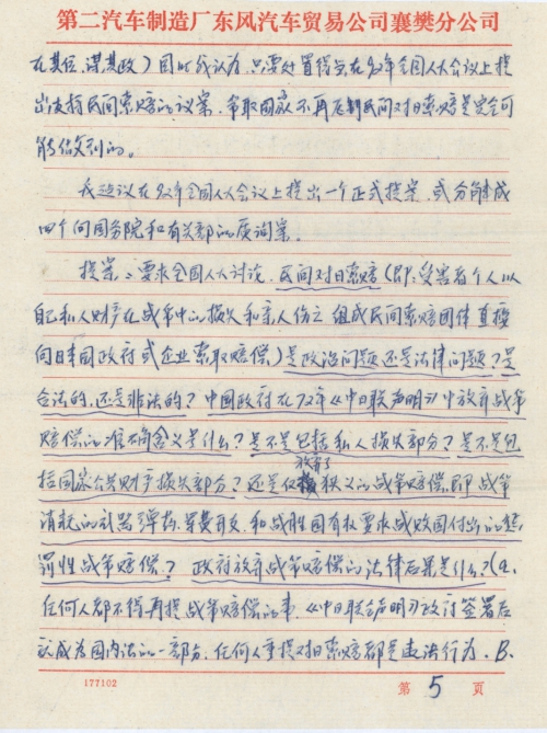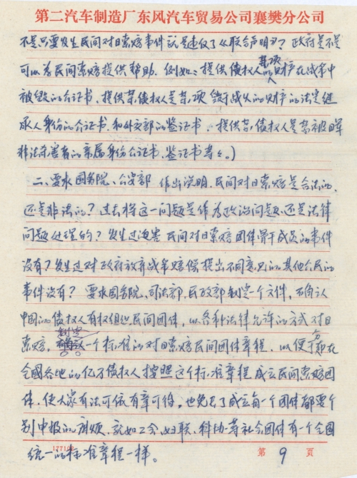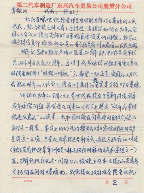 恕我冒昧地把您看作是有可能支持对日索赔的人民代表。除公开信之外又寄上这封进一步探讨如何在92年的全国人大会议上提出支持对日索赔具体提案的问题。您可以将这封信复印给您所知道的有可能支持对日索赔的代表传阅。