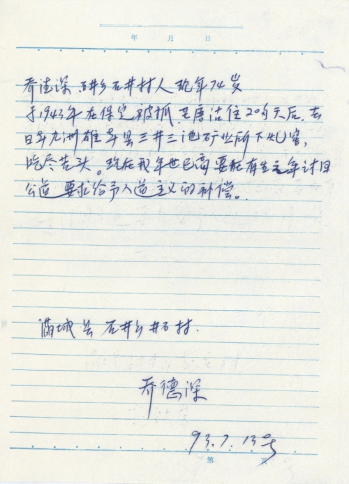 21 10 月, 2018 s3696 Share EmailTwitterFacebookGoogle +PinterestTumblrLinkedinVkontakte 信扫描序列号:s3696 写信日期:1993-07-13 写信地址:河北省保定市满城县 受害日期:1943 受害地址:河北省保定市 写信人:乔德深 受害人:乔德深 类别:劳工(SL) 细节:我1943年在保定被日军抓到日本做劳工吃尽苦头现要求给予人道主义赔偿。备注:信封丢失 乔德深,石井乡石井村人,现年74岁 于1943年在保定被抓,至塘沽住20多天后,去日本九州熊本县三井三池矿业所下煤窑,吃尽苦头。现在我年[事]已高要在有生之年讨回公道,要求给予人道主义的补偿。 满城县石井乡石井村 乔德深 93.7.13号 21 10 月, 2018 10000cfj_3o5som 劳工(SL)