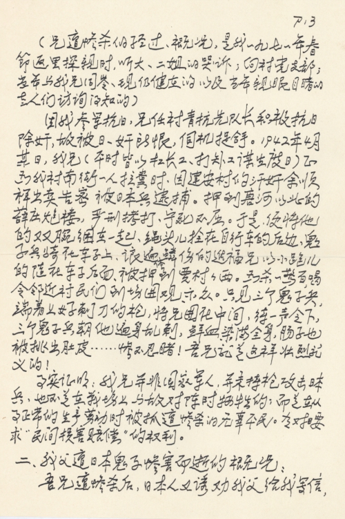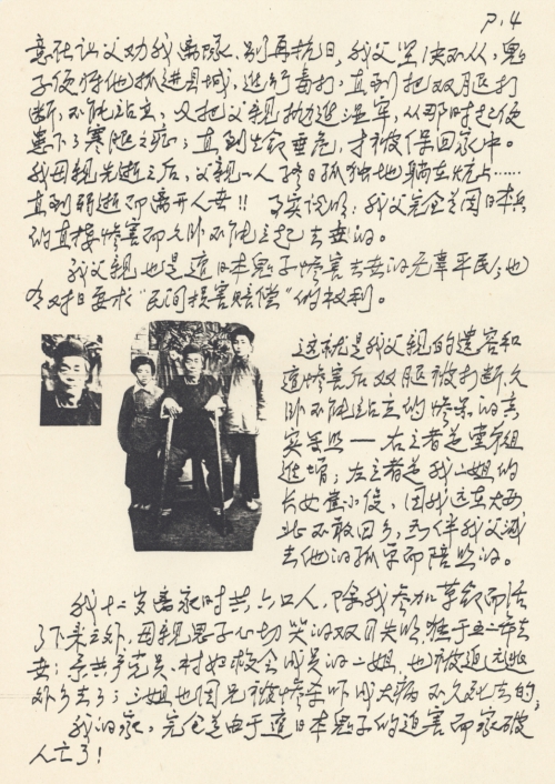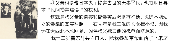 吾兄遭惨杀后,日本人又诱劝我父给我写信,意在让父劝我离队,别再抗日,我父坚决不从,鬼子便将他抓进县城,进行毒打,直到把双腿打断,不能站立,又把父亲抛进湿牢,从那时起便患下了寒腿之症;直到生命垂危,才被保回家中。我母亲仙逝之后,父亲一人终日孤独地躺在炕上……直到弱逝而离开人世!!事实说明:我父亲完全是因日本兵的直接惨害而久卧不能立起去世的。