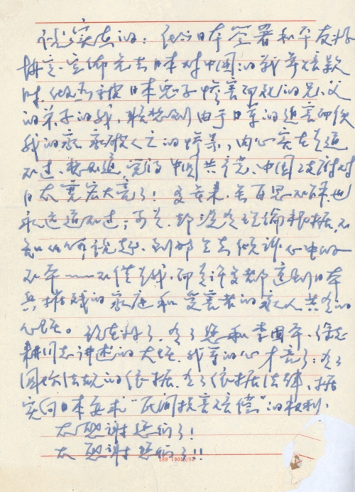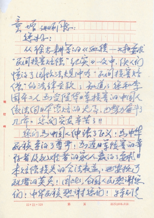 说实在的:在与日本签署和平友好协定,宣布免去日本对中国的战争赔款时,作为被日本鬼子残害而死的兄、父的弟、子的我,联想到由于日军的迫害而使我的家家破人亡的惨案,由心实在是通不过,想不通,觉得中国共产党。中国政府对日太宽宏大量了!多年来,虽百思不解,也永远通不过;可是,却没有理论根据,不知从何说起,到哪里去倾诉心中的不平……不仅是我,而是许多都遭到日本兵摧残的家庭和受害者的家人共有的心理。现在好了,有了您和李固平。徐志耕同志讲述的大理,我等的心才亮了:有了国际法规的依据,有了依据法律,据实向日本要求“民间损害赔偿”的权利。