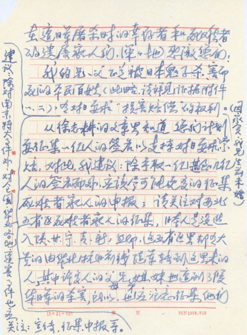 从徐志耕的文章里知道您们计划要征集的亿人的签名以支持对日要求索赔,对此,我建议,除争取一亿甚至几亿人的签名而外,应该尽可能更多的征集死难者家人的申报;请关注对西北五省区死难者家人的征集,日本人事没进入陕、甘、宁、青、新,然而,这五省区里却是大量的由华北抗日前线随军转到这里来的人,其中许多人的父母兄弟姐妹也遭到了侵华日军的杀害,所以,也应注意征集他们的申报;建议由全国人大及省县人大统一经办对日要求“民间损害赔偿”的事务,统一印制征集表发往全国各省区县市,按受害者(及家人)原籍分别征集申报;关于花费的支出和征集费用,应由各级人大统一支付;您和李固本同志在以往由个人支付的赔款额,将来应由受益者的资助补偿之。