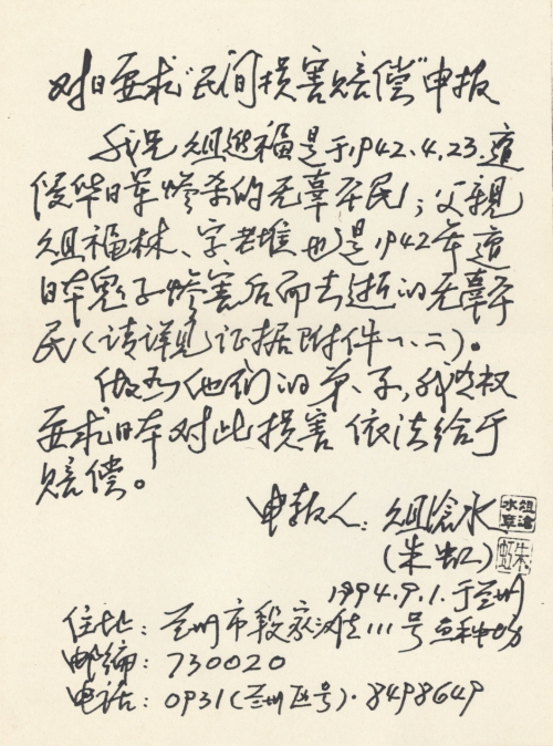 细节:我的伯父是于1942年被日军残忍杀害的无辜百姓,父亲是被日军残害后去世的,我作为受害者的后代有义务替他们讨公道,现寄上证明材料要求日本政府赔偿。