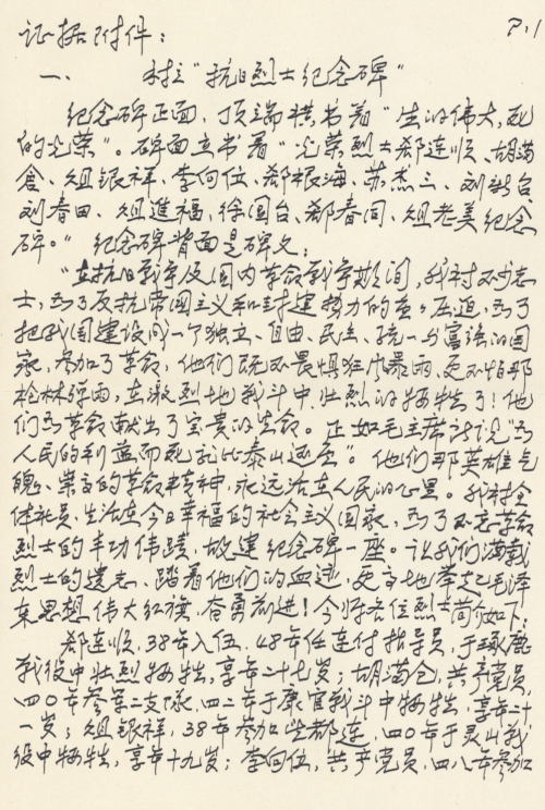 “在抗日战争及国内革命战争期间,我村不少志士,为了反抗帝国主义个封建势力的重重压迫,为了把我国建设成一个独立、自由、民主、统一与富强的国家,参加了革命,他们既不畏惧狂风暴雨,更不怕那枪林弹雨,在激烈地战争中,壮烈的牺牲了!他们为革命献出了宝贵的生命。正如毛主席所说“为人民的利益而死就比泰山还重”。他们拿英雄气魄,崇高的革命精神,永远活在人民的心里。我村全体社员,生活在今日幸福的社会主义国家,为了不忘革命烈士的丰功伟绩,故建纪念碑一座。让我们满载烈士的遗志,踏着他们的血迹,更高的举起毛泽东思想伟大红旗,奋勇前进!今将各位烈士简介如下: