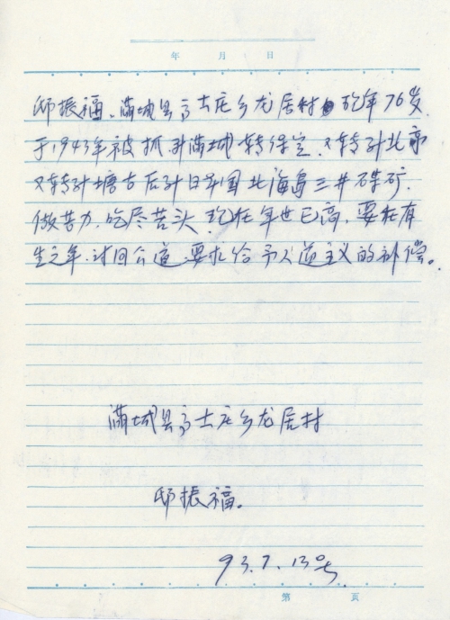 21 10 月, 2018 s3700 Share EmailTwitterFacebookGoogle +PinterestTumblrLinkedinVkontakte 信扫描序列号:s3700 写信日期:1993-07-13 写信地址:河北省保定市满城县 受害日期:1943 受害地址:河北省保定市满城县 写信人:邸振福 受害人:邸振福 类别:劳工(SL) 细节:邸振福于1943年被抓到日本北海道当劳工做苦力吃尽苦头。现要向日本政府讨回公道要求赔偿。备注:信封丢失 邸振福,满城县高士庄乡龙居村,现年76岁,于1943年被抓到满城县转保定,又转到北亭又转到塘沽后到日本国北海道三井煤矿,做苦力,吃尽苦头,现在年事已高,要在有生之年,讨回公道,要求给予人道主义的补偿。 满城县高士庄乡龙居村 邸振福 93.7.13号 21 10 月, 2018 10000cfj_3o5som 劳工(SL)