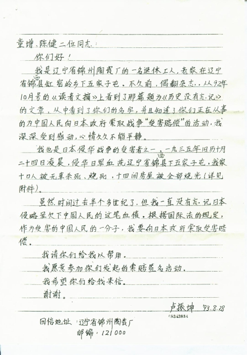 I am a retired worker from Jinzhou Ceramics Factory, Liaoning Province. I was born in Xiawujiazi Village, Gangyaoling Town, Jinxi County, Liaoning Province. The other day, I read an article entitled “History Is Not Forgotten” from Reader’s Digest [Editior’s note: This is not the Reader’s Digest in the West.] (published in October 1992). From the article, I came to know your names and that you had been working on demanding reparation from the Japanese government for the Chinese victims. I was deeply moved by your efforts.