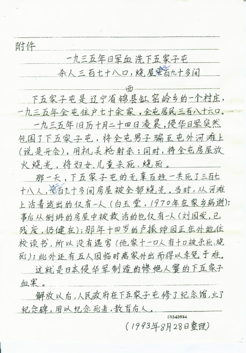 Other details:In 1935 the Japanese Army massacred Xiawujiazitun, Jinxi County, Liaoning Province. Houses in the village were burned, 378 persons were killed, and over a dozen people in my family were killed or burned to death. We demand Japan to give compensation. After liberation, the village built a memorial hall to educate the younger generation.