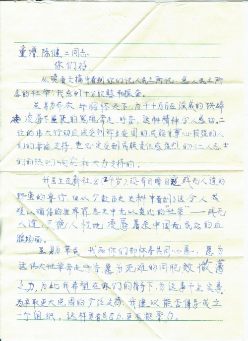 虽身为草民,我和你们却怀着共同心愿,愿为这伟大壮举奔走呼告,愿为死难的同胞效微薄之力,为此我希望在你们的指导下,为这事干点实事。为争取更大范围的广泛支持,我建议能否倡导成立一个组织,这样更有号召力,更有凝聚力。