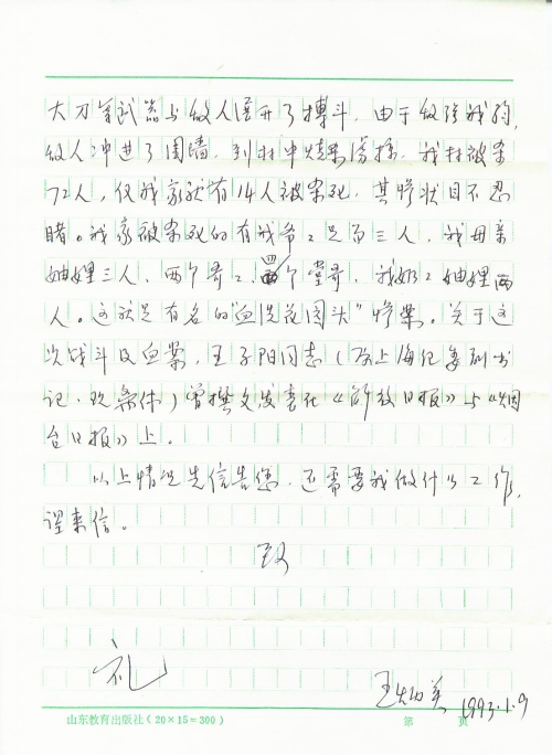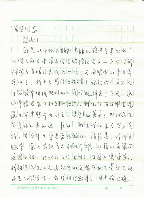 我是从学林出版社出版的“读者参考丛书”《国人向日本要求受害赔偿纪实》—文中了解到您与童增同志在为一项正义而艰难的事业奔走呼号,我十分感谢和敬重!你们为千百万在日寇侵华期间死难的中国同胞伸张了正义,这件事情若有了如期的结果,我们亿万受难者家属也可告慰于九泉之下先烈的英灵!对你们几年来所从事的这一活动,我及我的亲人全力支持,若有什么事需要我做的,请信告,我叫王炳英,系山东教育出版社干部,祖籍山东莱西花园头村。1938年3月18日,日寇入侵胶东,我祖父弟兄三人与村中的父老在地下党组织及民先的领导下,自发组织起来,用土枪土炮,大刀等武器与敌人展开了搏斗,由于敌强我弱,敌人冲进了围墙,到村中烧杀掳掠,我村被杀72人,仅我家就有14人被杀死,其惨状目不忍睹。我家被杀死的有我爷爷兄弟三人,我母亲妯娌三人,两个哥哥,四个堂哥,我奶奶妯娌两人。这就是有名的“血洗花园头”惨案。关于这次战斗及血案,王子阳同志(原上海纪委副书记,现离休)曾撰文发表在《解放日报》与《烟台日报》上。