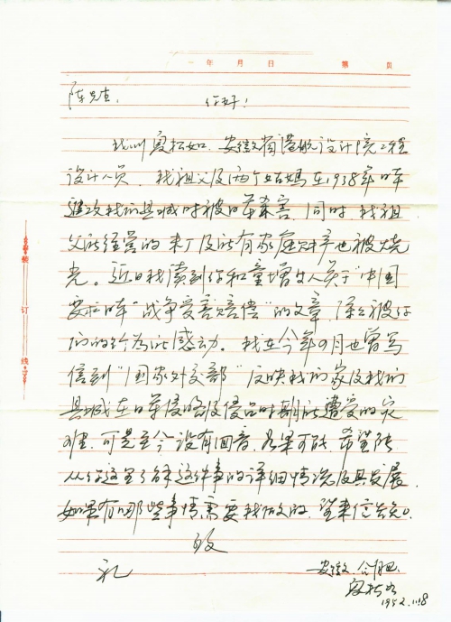 我叫夏松如,安徽省港航设计院工程设计人员,我祖父及两个姑妈在1938年日本进攻我们县城是被日军杀害,同时,我祖父所经营的米厂及所有家庭财产也被烧光。近日我读到你和童增等人关于“中国要求日本战争受害赔偿”的文章,深深被你们的行为所感动。我在今年四月也曾写信到“国家外交部”反映我们家及我们县城在日军侵略及侵占时期所遭受的灾难,可是至今没有回音,如果可能,希望能从你这里了解这件事的详细情况及其发展。如果有哪些事情需要我做的,请来信告知。