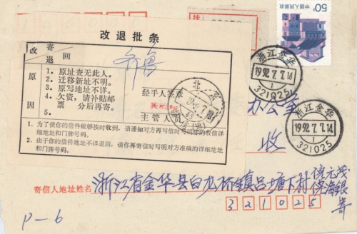 写信地址:浙江省金华市金华县