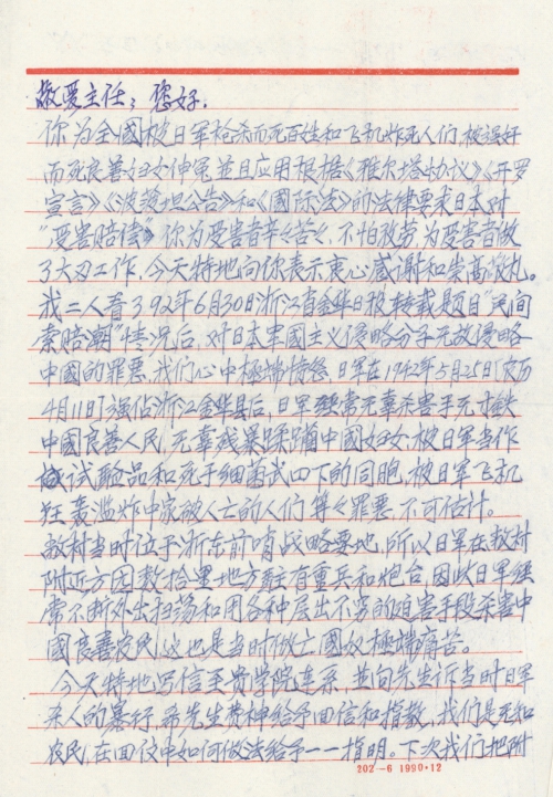 你为全国被日军枪杀而死百姓和飞机炸死人们,被强奸而死良善妇女伸冤并且应用根据《雅尔塔协议》《开罗宣言》《波茨坦公告》和《国际法》的法律要求日本对“受害赔偿”你为受害者辛辛苦苦,不怕孜劳,为受害者做了大量工作,今天特地向你表示衷心感谢和崇高敬礼。我二人看了92年6月30日浙江省金华日报转载题目“民间索赔潮”情况后,对日本军国主义侵略分子无故侵略中国的罪恶,我们心中极端愤怒,日军在1942年5月25日[农历4月11日]强[占]浙江金华县后,日军经常无辜杀害手无寸铁中国良善人民,无辜残暴蹂躏中国妇女,被日军当作试验品和死于细菌武器下的同胞,被日军飞机狂轰滥炸中家破人亡的人们等等罪恶,不可估计。