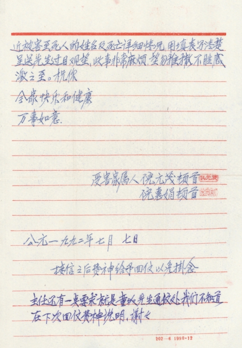 今天特地写信至贵学院体系,并向先生诉当时日军杀人的暴行,希先生费神给予回信和指教,我们是无知农民,在回信中如何做法给予一一指明。下次我们把附近被害至死人的姓名及死亡详细情况用填表写清楚呈送先生过目观望,此事非常麻烦,望勿推撤,不胜感激之至。