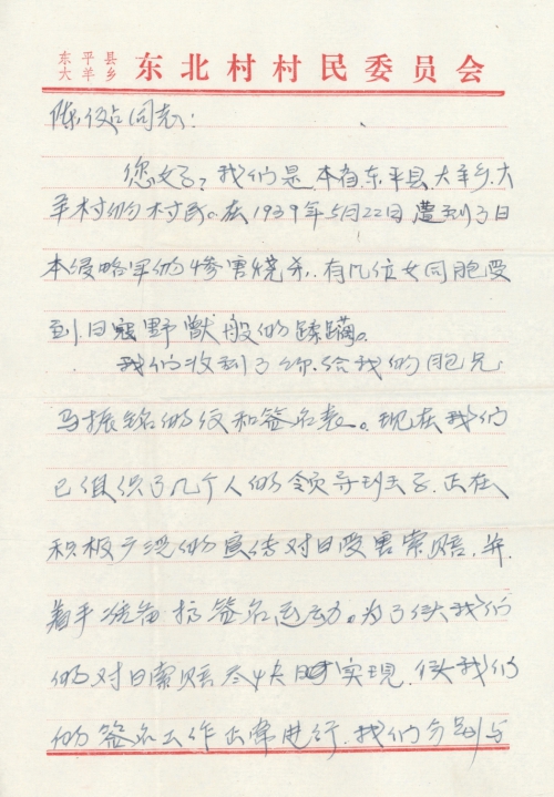 您好!我们是本省东平县大羊乡大羊村的村民。在1939年5月22日遭到了日本侵略军的残害烧杀,有几位女同胞受到了日寇野兽般的蹂躏。