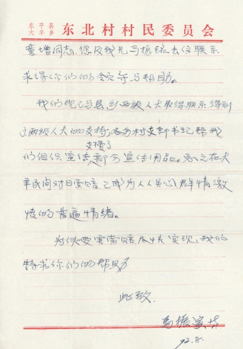 我们收到了你给我的胞兄马振铭的信和签名表。现在我们已组织了几个人的领导班子,正在积极广泛的宣传对日受害索赔,并着手准备搞签名运动。为了是我们的对日索赔尽快实现,使我们的签名工作正常进行,我们分别与童增同志,您及我兄马振铭去信联系,求得你们的领导与帮助。