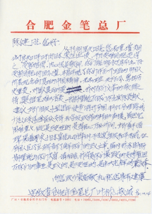 从刊物里知晓您和童增,共同出于良知呼吁向日本索还血债,千万受难同胞应得之。“受害赔偿。”内心很是敬仰,你们能够挺身而出,为受害同胞讨回公道。本身体现了你们作为一个正直的中国人所表现出的真正的中国精神:无私正直,天下为公,勇担历史重责。对国人真正的爱。我对你们义举的敬佩之情,真是拙笔难以言表。我盼望能为你们作出实际贡献。建议立即组织小型团体徒步游行全国,制定合理路线广泛征求沿途民众支持和各级政府的帮助声援。虽然它困难重重,但它是历史性的是得民心万众所向。立即着手循正常渠道要求小日本皇佬儿访华时于北京组织和平示威,让全国人民乃至世界都了解你们的正义之举。届时我亦盼盼期望能与你们共肩。请相信,我将是你们最坚定的支持者,因为你们的事业,是正义的,是历史性的,是伟大光辉的崇高义举。