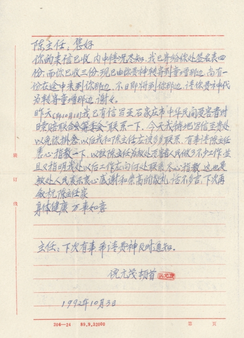 昨天[即10月1日]我已有信写至石家庄市“中华民间受害者对日索赔联合会筹委会”联系一下。今天我特地写信至贵处,以免你挂念,以后陈主任为敝处受害者人民做了不少工作,并且又指明我处以后工作应向何处联系,尽心指教,这也是敝处人民表示衷心感谢和崇高的敬礼,话不多言,下次再叙祝陈主任家